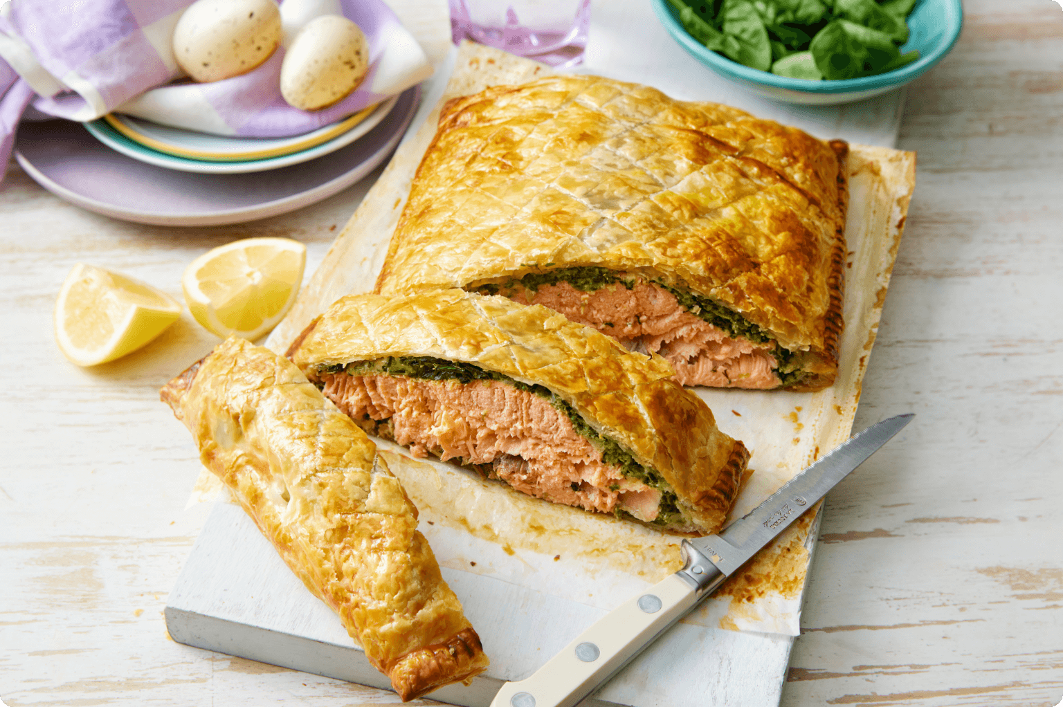 Salmon wrapped in golden puff pastry with spinach and a touch of cream cheese. It’s rich, comforting, and perfect for a weekend dinner or special occasion. Swapping the beef for salmon makes it an easy way to enjoy a lower-carbon protein with plenty of flavour.